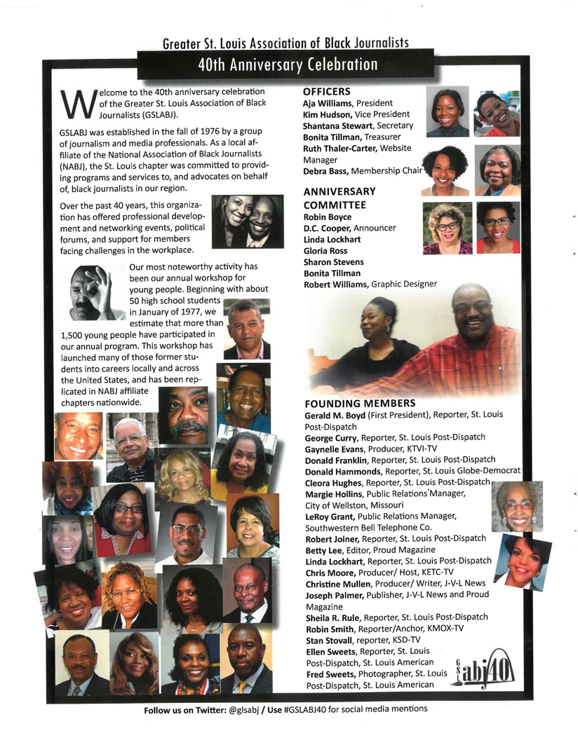 The Greater St. Louis Association of Black Journalists will observe its 40th anniversary at 7 p.m. Saturday, December 3 at Nine Network of Public Media, 3655 Olive St., with a celebration recognizing four journalists.